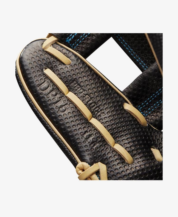Designed for young players and middle infielders with smaller hands, the iconic 2022 A2000® SCDP15SS features Pedroia Fit construction with a narrower wrist opening and shorter finger stalls. Spin Control Technology™ on the Black Pro Stock® leather palm and H-Web increases friction between the ball and the glove, allowing for sure outs and quick transfers. The Black SuperSkin™ reduces glove weight while improving durability, and Blonde laces and binding tie it all together.