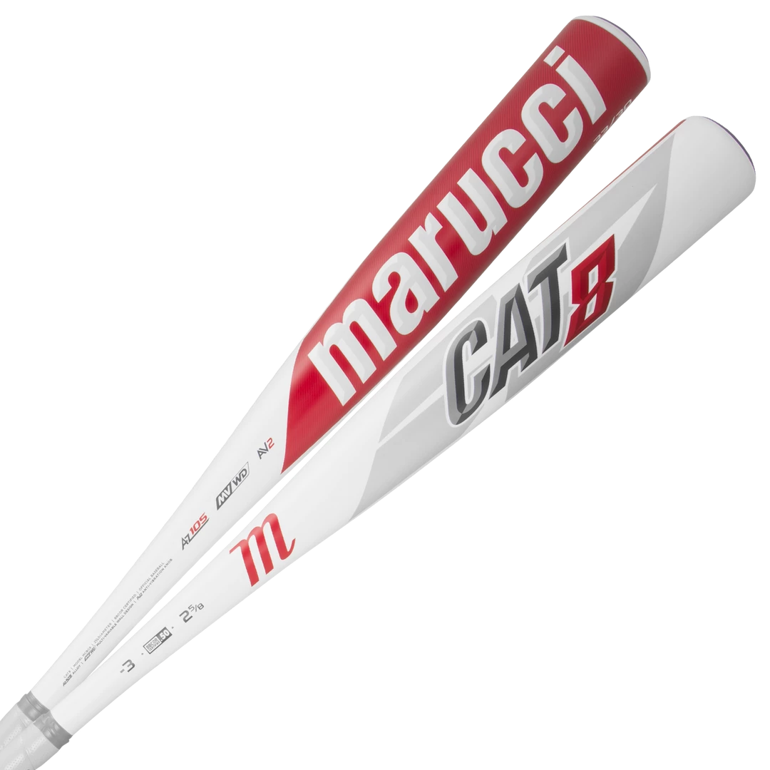 The CAT8 BBCOR is a one-piece alloy bat built with AZ105 super strength aluminum alloy meaning thinner walls, higher response rate, and better durability. The precision-balanced barrel features a ring-free multi-variable wall design that creates an expanded sweet spot, while the patented AV2 Anti-Vibration knob produces a better feel and less negative feedback.